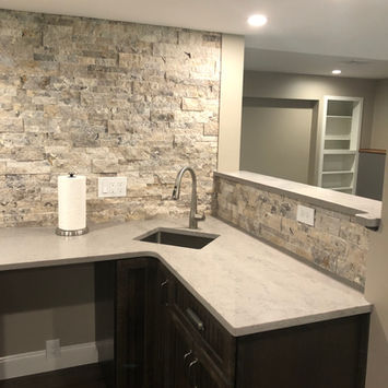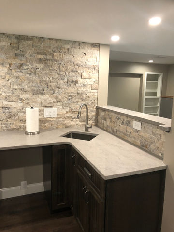 Transforming this basement required the assistance of our interior designer and structural engineer. We began by expanding the room, which resulted in over 2000 square feet of additional space and allowed for the construction of a full bath and bar space. Hardwood floors, a stone backdrop, dark cabinets and columns were installed to give this room the rustic feel our customers wanted when entertaining family and friends.
